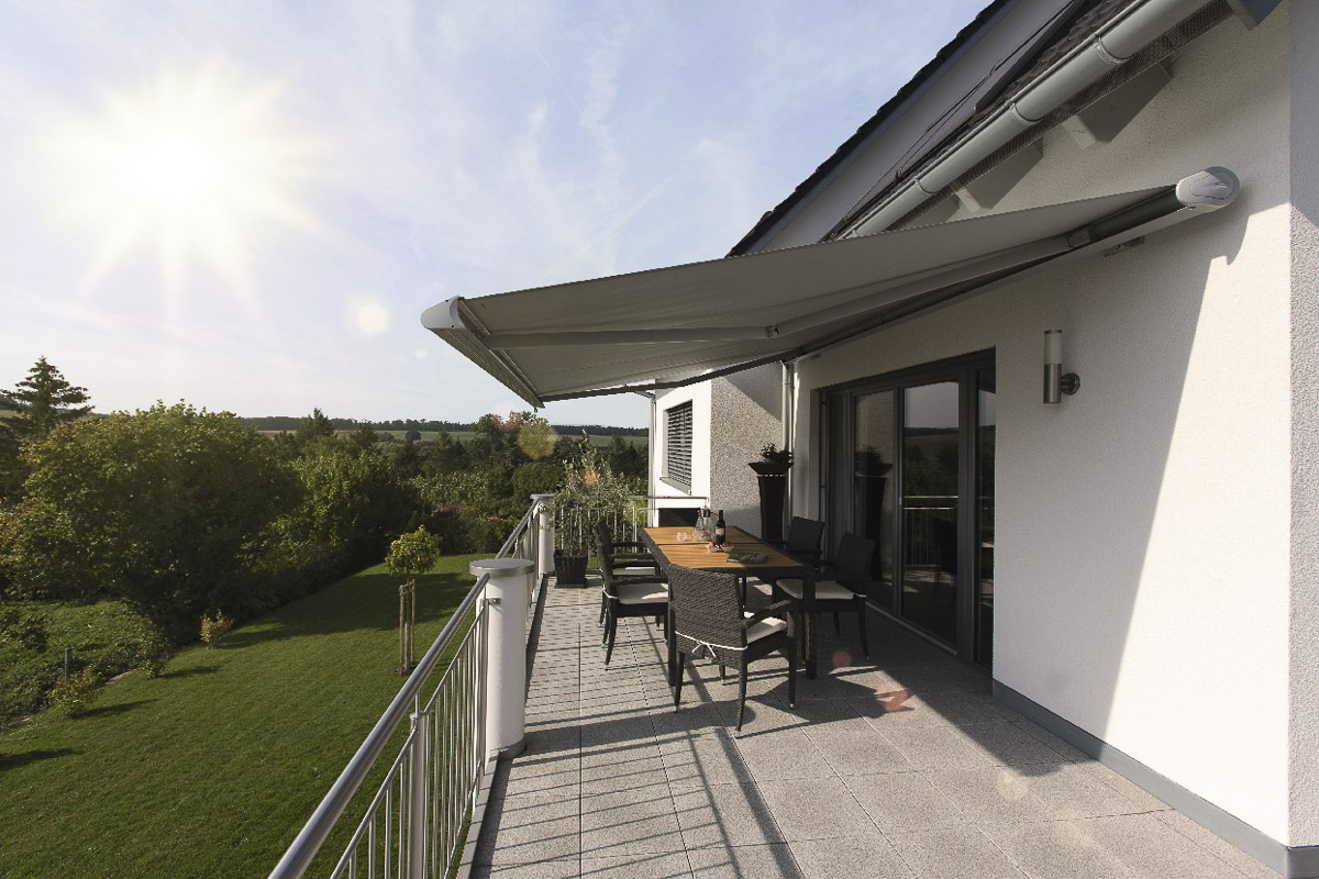 Offene Gelenkarmmarkisen: Klassiker unter den Sonnenschutzprodukten für die Terrasse; wahlweise dezent in die Fassade integriert oder als herausragendes optisches Highlight; große Neigungswinkel einstellbar; für geschützte Terrassen.