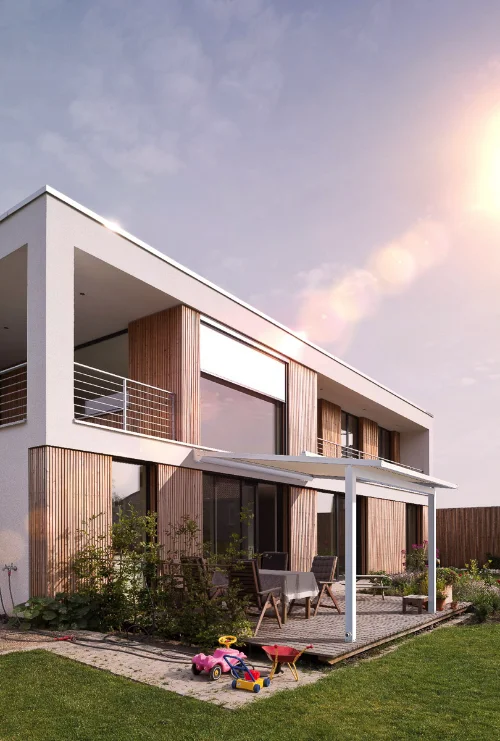 Seitenmarkisen: praktische Ergänzung für Terrassenmarkisen, die Ihnen Sicht-, Wind-, Blend- und Regenschutz von den Seiten bietet.