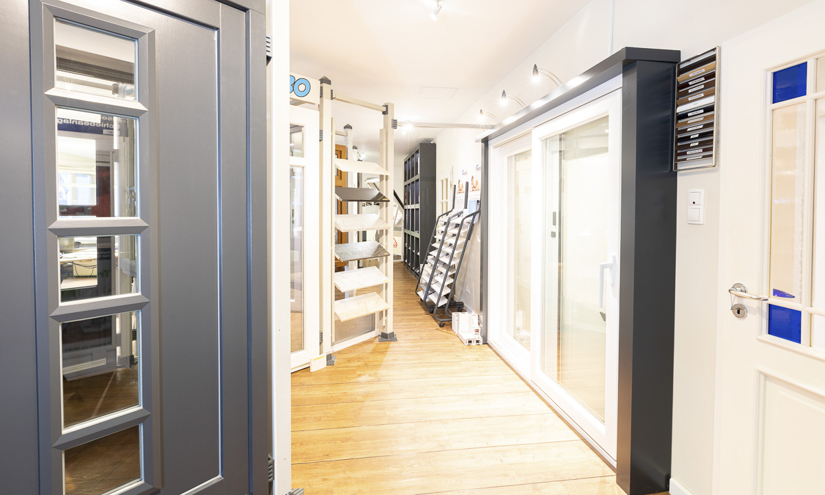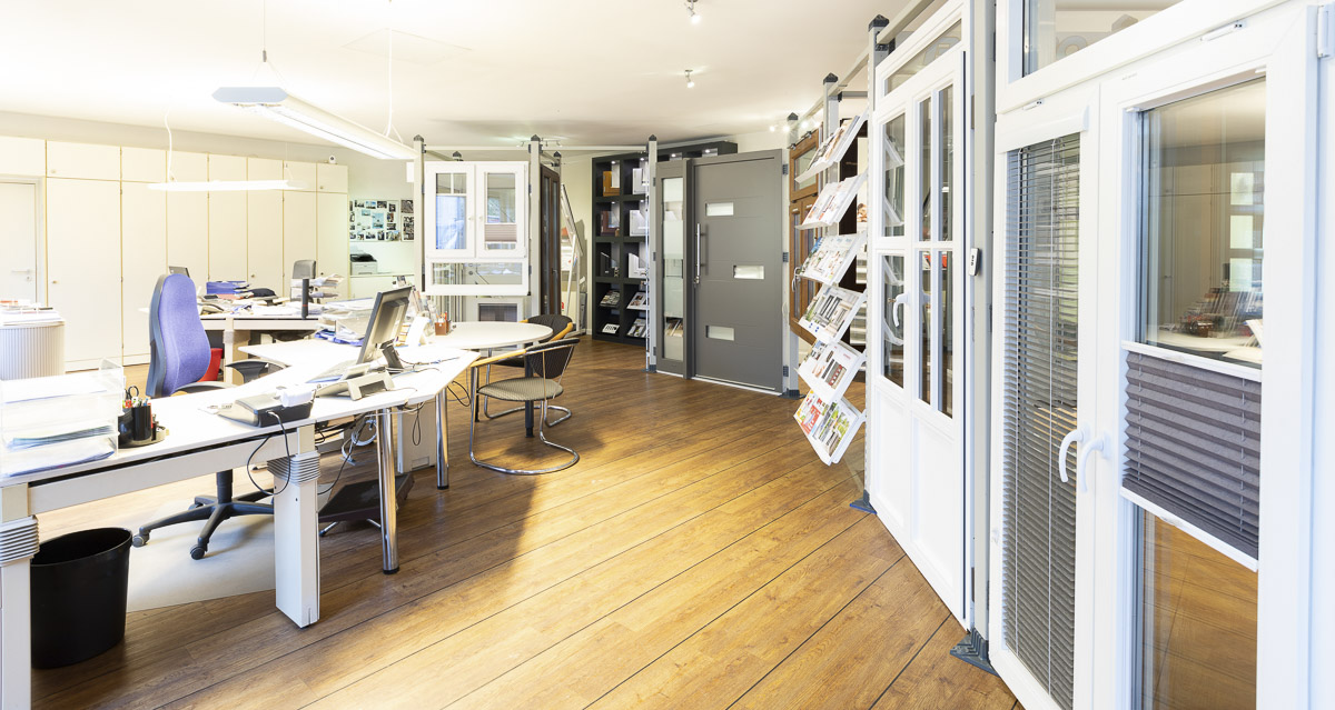 In unseren neuen Räumlichkeiten haben wir viele Produkte verbaut, die wir auch unseren Kunden anbieten. Zusätzlich gibt es eine Ausstellung mit vielen Beispielen, Farb- und Materialmustern und Konstruktionsansichten.